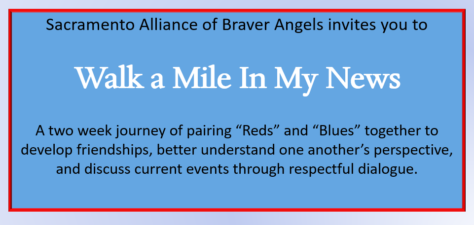 You are invited to come and observe the “Walk a Mile in My News” Reunion Call tomorrow night, Thursday, June 24th, at 6:00 pm Pacific to hear back from the 30+ Blue-and-Red pairs as they share about their paired experiences, what they learned, what challenged them and what inspired them! This all started right here in Sacramento! Hope you can participate! Here is the link https://us02web.zoom.us/meeting/register/tZ0rf-6rqz8jHd4F_YE8tgnjBBbHAxP3kGq